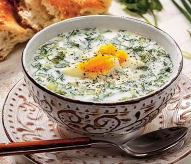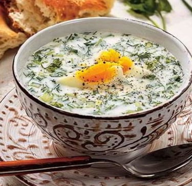 Ovdukh is a distinctive yogurt-based soup, served cold and popular in many culinary cultures. This delicious dish is made by blending fresh yogurt with water, boiled meat, and a variety of fresh ingredients, including hard-boiled eggs, crunchy cucumbers, and aromatic herbs like dill and mint, which lend it a unique and refreshing aroma. Its creamy texture and delicate flavor make it ideal for hot summer days. It's a light, nutritious, and flavorful dish, perfect as an appetizer or even a main course, often accompanied by pita bread or croutons. The ingredients may vary slightly depending on local traditions, but the end result is always appreciated by those who love fresh, light dishes.