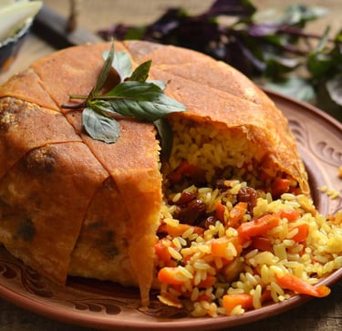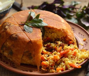 An Azerbaijani version of plov, a popular dish in the Caucasus and Central Asia made with rice lavishly seasoned with beef or chicken, dried fruit, vegetables, and spices. This dish is known for its rich flavor and variety of ingredients, which can also include nuts and raisins, making it not only nutritious but also very aromatic. It is often served during celebrations and holidays, becoming a symbolic dish of the region's gastronomic culture.