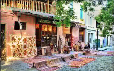 During your tour of Georgia, your guide will be able to advise you on what to buy and what not to buy. Here, we'd like to share some souvenirs you can bring back from your trip to Georgia. Georgia is famous for its carpet production , featuring typical traditional patterns. You can also find splendid jewelry lacquered using a local technique called Minankari , in vibrant colors and designs ranging from classic to religious to modern and contemporary. The metals used to produce earrings, bracelets, rings, and pendants range from the affordable to the expensive. We've already mentioned wine production; a good bottle of Georgian wine or Georgian grappa ( chacha ) can be a wonderful souvenir to take home. We can't fail to mention the wonderful spices you can buy at great prices in Georgian markets, where you can also purchase excellent dried fruit . Churchhela , a delicacy made of walnuts soaked in grape must and flour, deserves special mention , a typical Georgian snack.