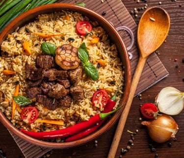 A famous Uzbek dish of vegetables, meat, and rice, topped with carrots and raisins. Each region of the country has its own recipe, and the cooking method is similar to rice pilaf. This traditional dish is not only nutritious but also rich in flavor, with each ingredient contributing to a unique culinary harmony. Plov is often prepared for special occasions and can vary greatly from family to family, making each tasting experience unique and memorable. It's also common to see plov served in large platters, where people gather to share, reflecting the importance of conviviality in Uzbek culture.