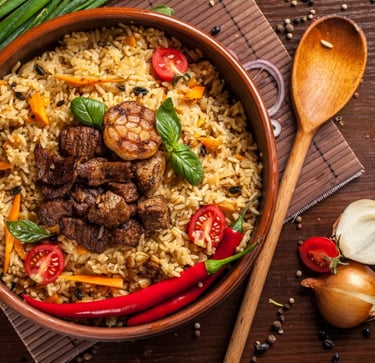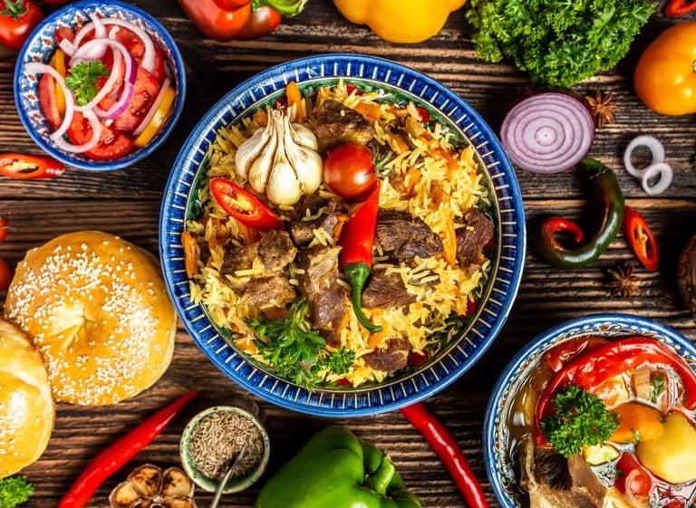 You can't fully immerse yourself in Uzbek culture without trying its incredible and diverse cuisine. Traditional Uzbek cuisine is unique in the world for its immense variety and its spicy yet balanced flavors that delight the palate. Main dishes are predominantly meat-based, with lamb and beef being the most popular choices, showcasing the rich culinary heritage of the region. Fish and poultry, while also present, are less common but can offer a refreshing alternative. Numerous abundant spices and fresh vegetables frame wonderful and never boring dishes, spiced just right to create a symphony of flavors. Uzbekistan is notably a major exporter of high-quality fruit, such as succulent melons and sweet cherries, which are definitely well worth trying. Here’s a small selection of this wonderful culinary tradition, which is not only rich in history but also tantalizing to the taste buds, making it worth trying during your trip to Uzbekistan. From the famous plov to mouthwatering manti, each dish tells a story, inviting you to experience the warmth and hospitality of the Uzbek people.