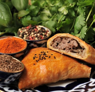 A savory puff pastry pie with a meat filling, usually baked in a tandoor. This dish, originating from several culinary traditions, varies depending on the region and available ingredients. Beef, lamb, chicken, and sometimes even potatoes or pumpkin are used as fillings for samsa. Some recipes also include aromatic spices like cumin and coriander, which lend an inviting aroma and rich flavor. It's common to find samsa served as an appetizer or snack during the holidays, the ideal accompaniment to a hot drink or spiced tea. Many enjoy the contrast between the crispiness of the puff pastry and the soft, juicy filling, making it a popular choice in many families. This dish represents not only a delicious gastronomic experience but also a symbol of conviviality, bringing friends and family together around the table to enjoy it together.